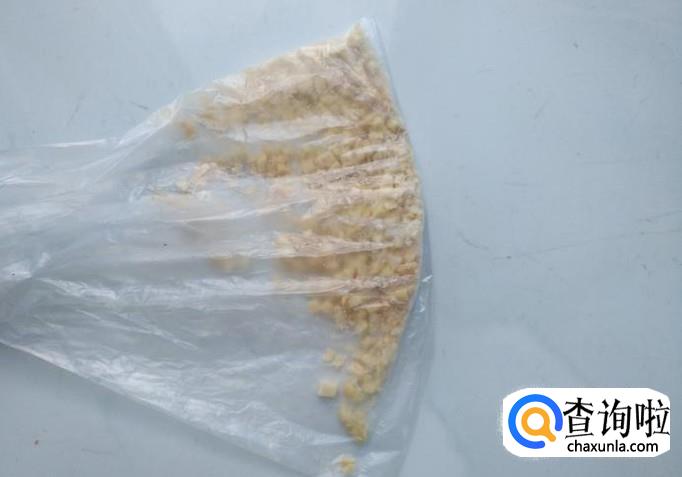 把熟花生去皮剥好后将剥好的花生豆装入保鲜袋中,用擀面杖敲成碎末状备用。
