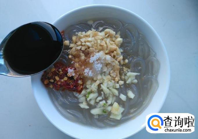 然后依次放入辣椒油、蒜末、花生碎、适量的盐和糖,最后倒入2勺陈醋,搅拌均匀后就可以享用了。