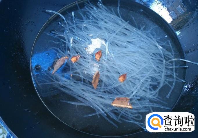 锅内烧水,水开后放入粉条和大料瓣及桂皮一起煮制。