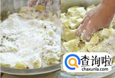 向土豆泥中加入土豆粉,搅拌均匀,再将其揉成面团。
