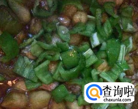 茄子炒至微软后,将青椒块倒入锅中,加入适量的盐,搅拌均匀。