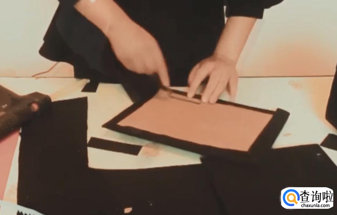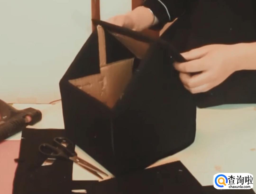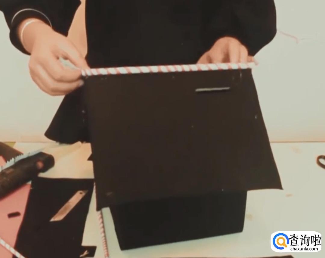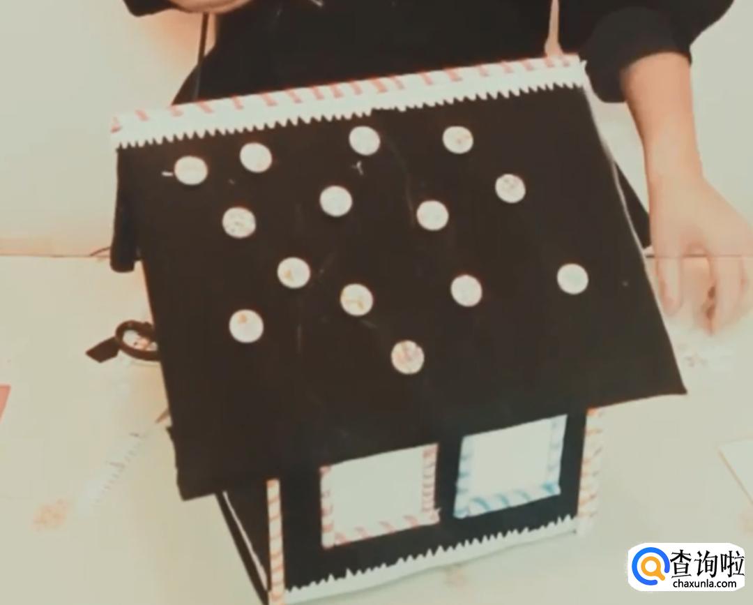 在小屋上涂一层溶胶,用黑色的瓦楞纸粘贴包裹。