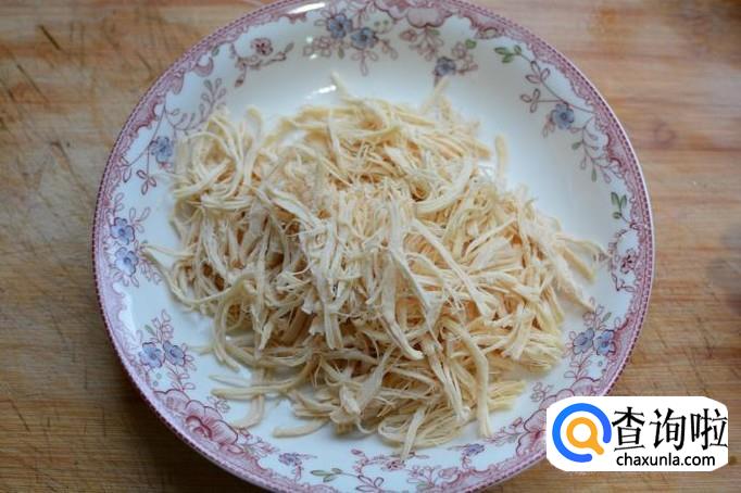 鸡肉冷却后将鸡丝鸡肉,撕成鸡丝,鲜鸡蛋切开。