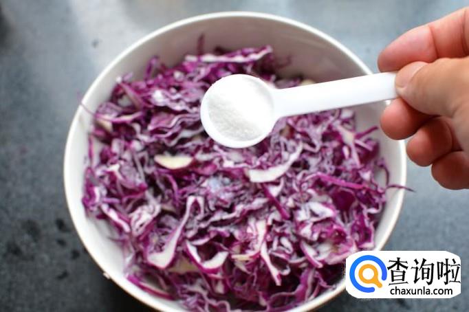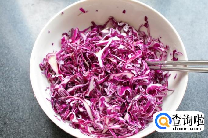 紫甘蓝切丝洗净晾干,放入碗中,撒入适量的盐,这里盐不要过量,正常炒菜的量就足够了,因为紫甘蓝看起来硬,其实很容易腌制入味,多放盐会导致太咸。然后,将紫甘蓝拌匀腌制10到15分钟,这段时间,中间适当的翻一下。