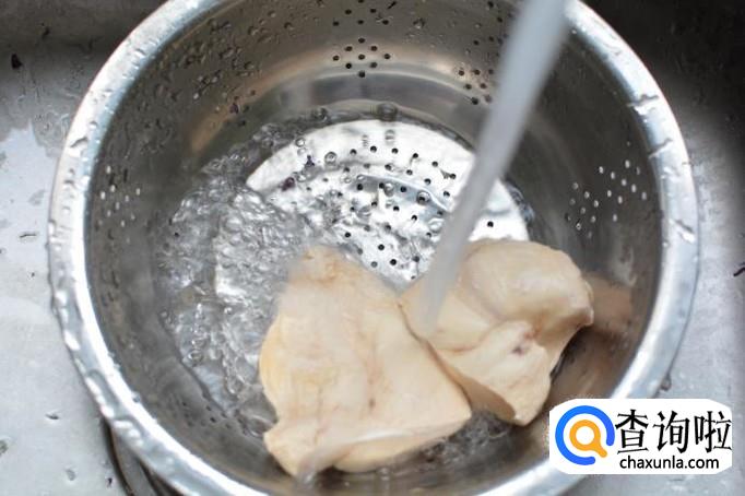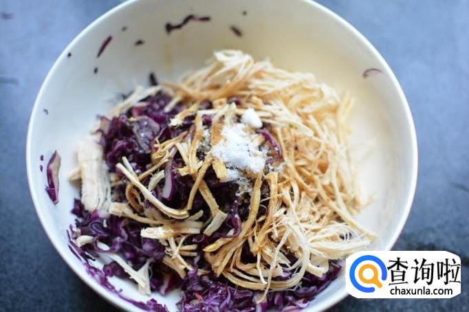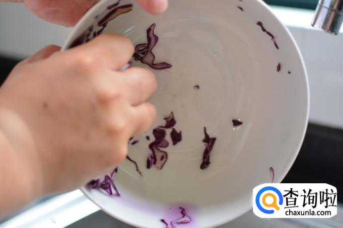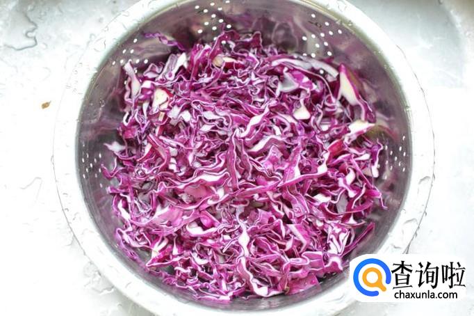 时间到了以后,将紫甘蓝里的水用力挤尽。鸡肉熟了以后,立即捞出用冷水过激。