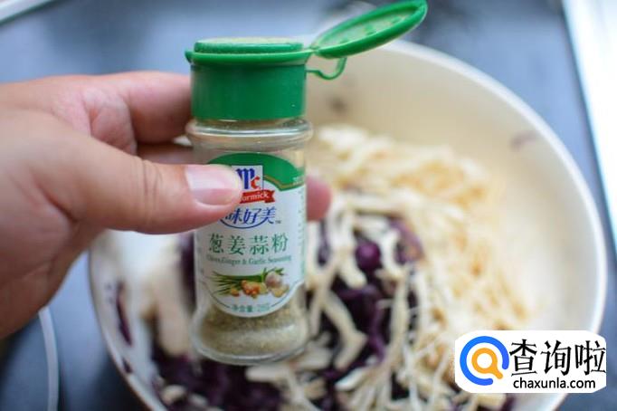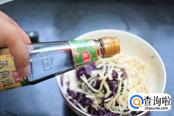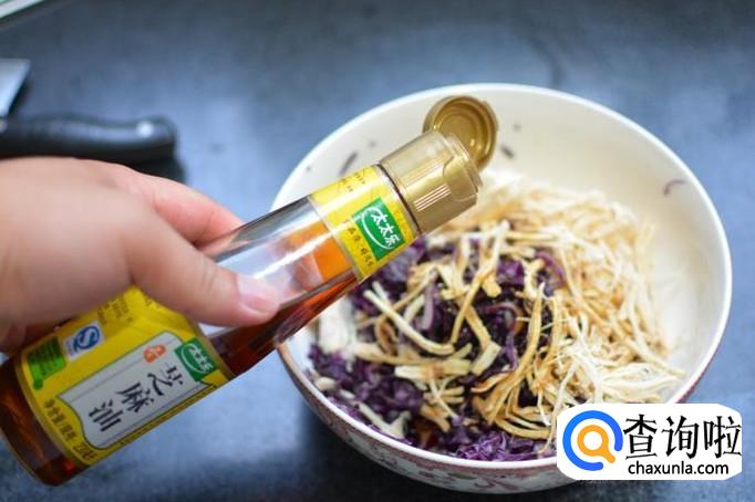 将鸡丝和紫甘蓝放在一起,放入香油,蒸鱼豉油,少量生抽,少许量糖,如果口味重的话可以放一点葱姜蒜粉、蒜泥或胡椒粉均可。