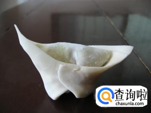 用手将开口处捏紧。封好口后,将饺子皮下方角用手翻过来。然后,极其捏紧即可。