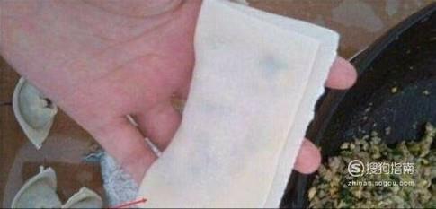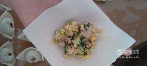 然后,将饺子皮放置于手掌之上,用勺子挖出少许调制好的饺子馅,放在饺子皮上