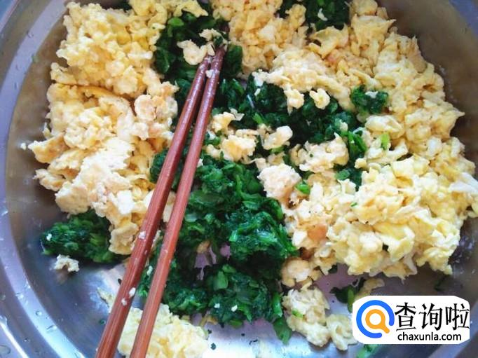 鸡蛋碎放凉之后放进盆里,把刚刚剁好的小白菜也放进去。