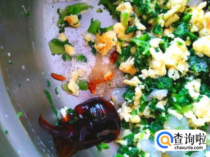 将虾仁(或者虾皮)放进去,然后加入一勺子耗油,一些食盐,将其搅拌均匀,菜团子的馅就做好了。