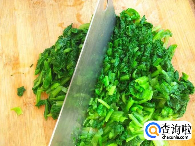 小白菜里面的水要挤干,不用担心挤干水之后的小白菜干巴巴的没味道,当你把小白菜剁碎之后,小白菜里面还会有一些自己的汁液出来。小白菜剁碎,用手挤一下,把里面的汁水挤出来一些。