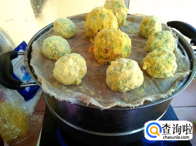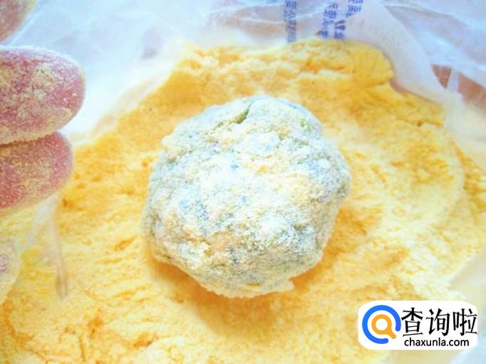 准备一些玉米面,把团好的菜团子直接放进去,注意不要用手捏来捏去,菜团子会碎的。