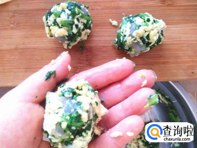 我没带手套,怪麻烦的,双手洗干净用手团就行。把馅放进手里团成团子,大小随你自己的便,我喜欢做这样小巧一些的,看着就有食欲,分别将菜团子团好。