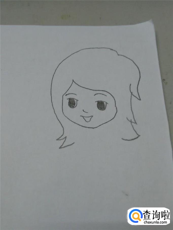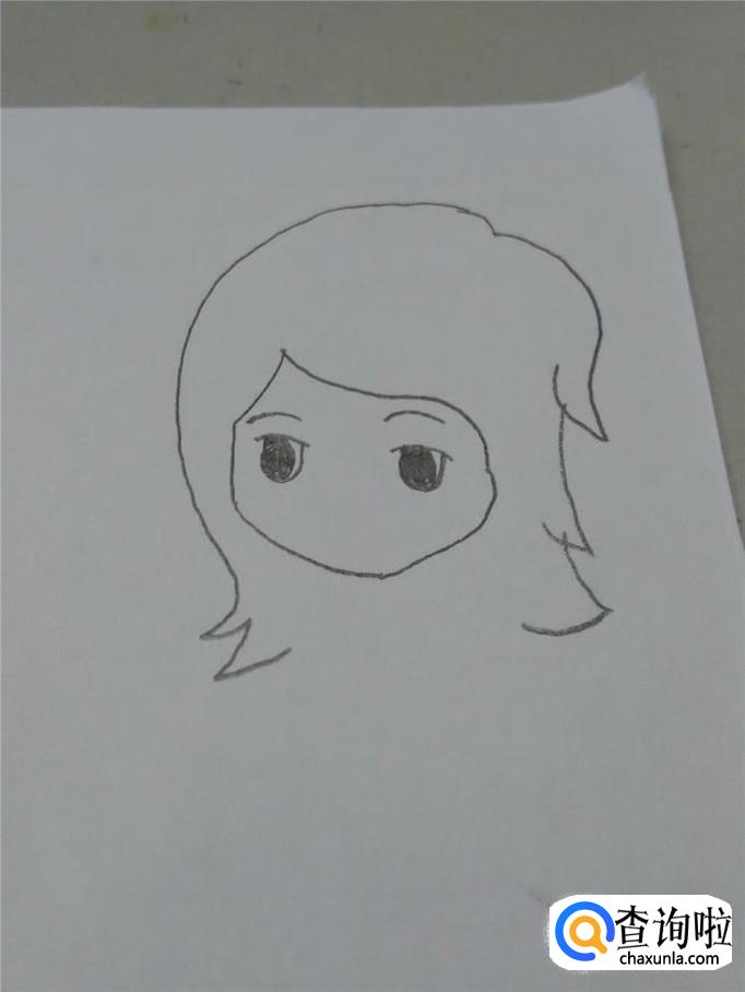在脸上画两条稍弯的短线,表示眉毛,再画出两只眼睛,眼睛上方是平的,下面画成圆弧形,在眼睛里面画出大大的黑眼珠,只留一小块白边,当作眼白即可,女孩眼睛大,显得很可爱。
