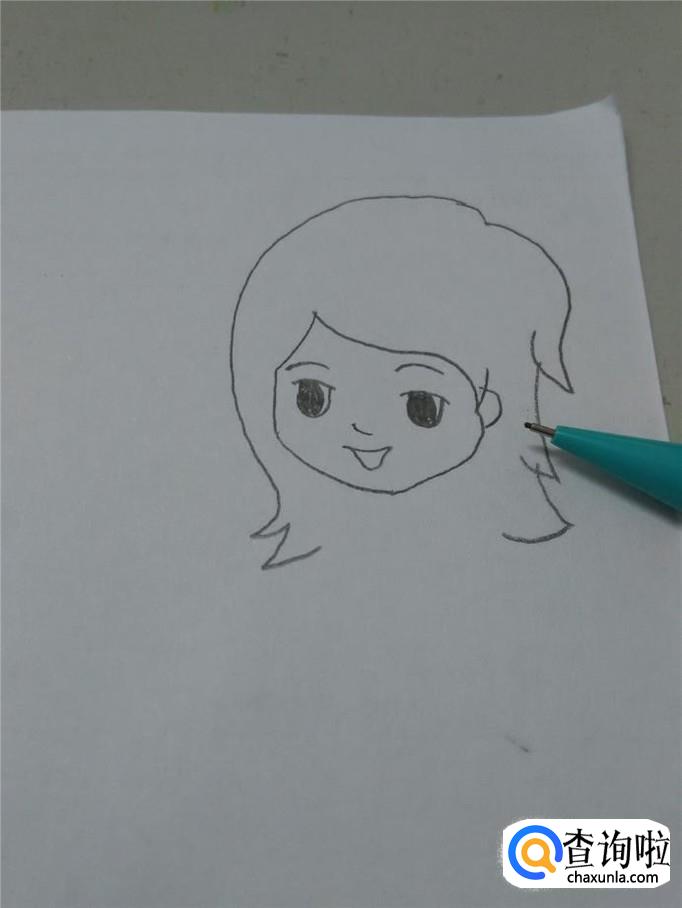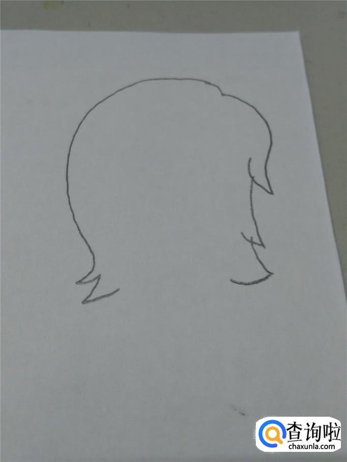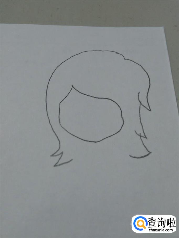 女孩子们都有一头漂亮的头发,所以先从头发画起,画出齐肩发的轮廓,两侧画几个尖,表示一缕缕的头发梢。