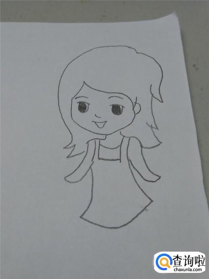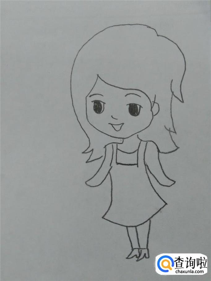 有脖子的下方画一条连衣裙,从肩往下画两条带子,表示吊带裙。在吊带裙的上方画一条短短的弧线,表示里面穿的背心。