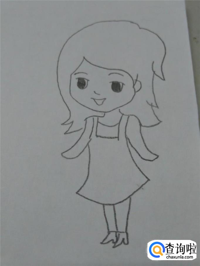 最后,从裙摆下方画两条细细的小腿,再画两只尖尖的高跟鞋,女孩就画完了,这幅画是卡通风格,所以头大身小,显得女孩特别灵秀可爱。
