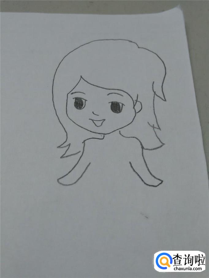 用笔在头的下面画出细细的脖子、窄窄的肩膀和摊开的手臂,手臂和手只画简单的线条即可,不用细画,这样反而显出女孩的可爱。