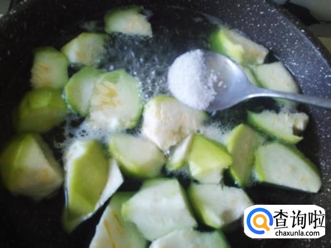 锅里装适量的水煮沸,然后放丝瓜进去,加2勺香油、适量的盐,煮10秒左右。