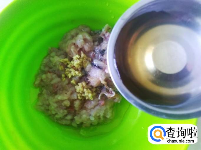 把鱼肉剁成肉饼,加适量的盐、姜蓉、2勺香油。