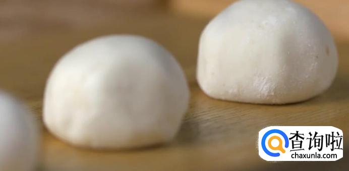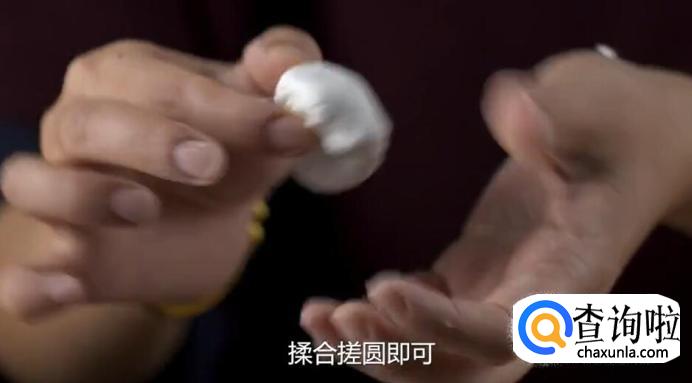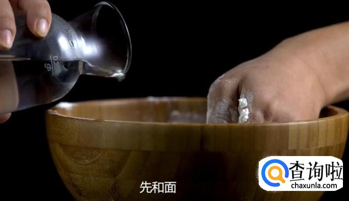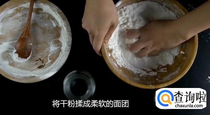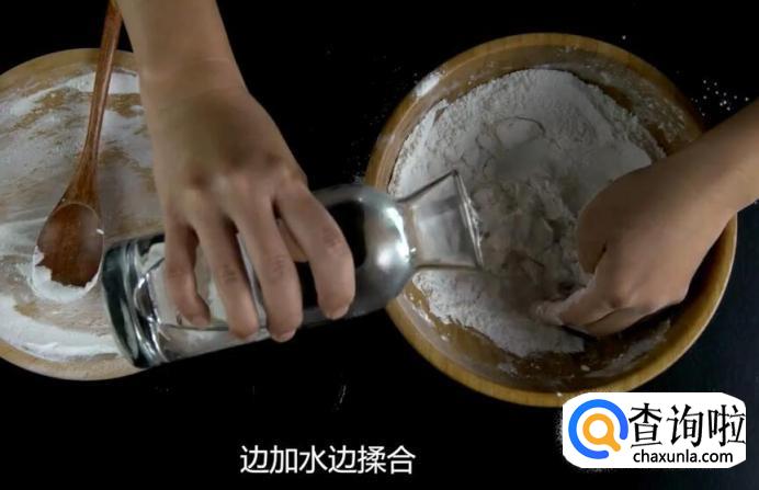 将温水慢慢加入糯米粉中,一边加水一边糅合,将干粉揉成柔软的面团。