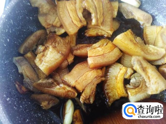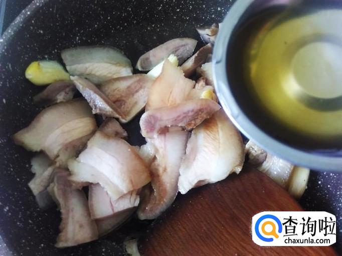 猪头皮下锅,加适量的盐翻炒一下。