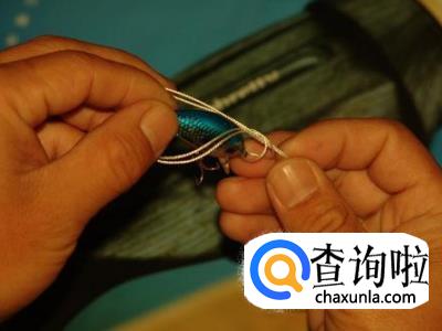 将前端导线打结套在别针小圈上,然后将别针大圈扣在假饵的米诺舌板连接环上;