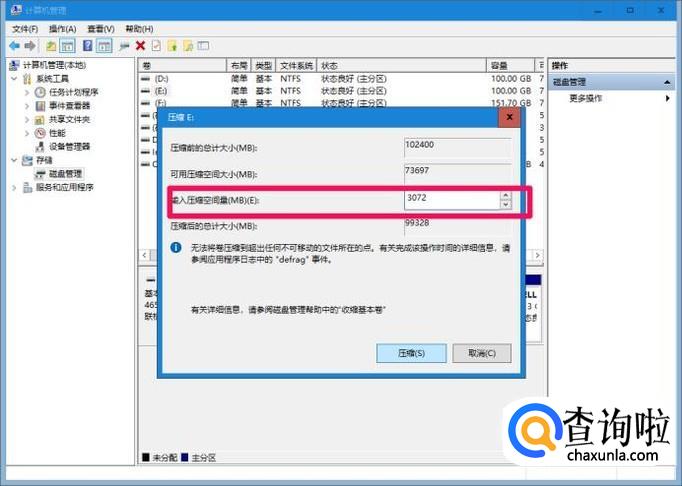 【输入压缩空间量】就是你最后所分得盘的大小,此时注意要小于【可用压缩空间大小】,不然会造成电脑文件的丢失