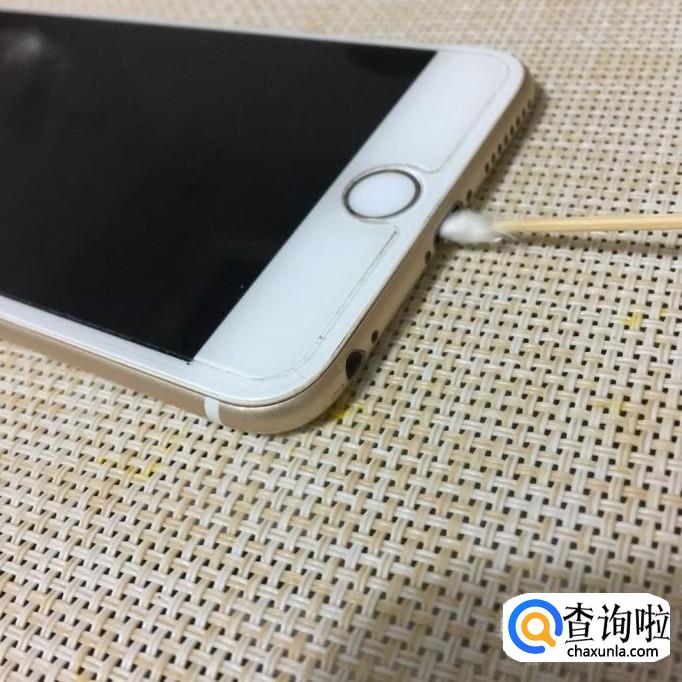 接着用牙签取出棉签上的一小团棉花并沾上适量的酒精擦拭苹果手机的充电孔,如下图所示。