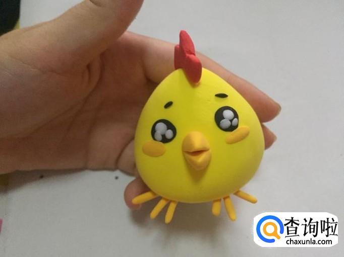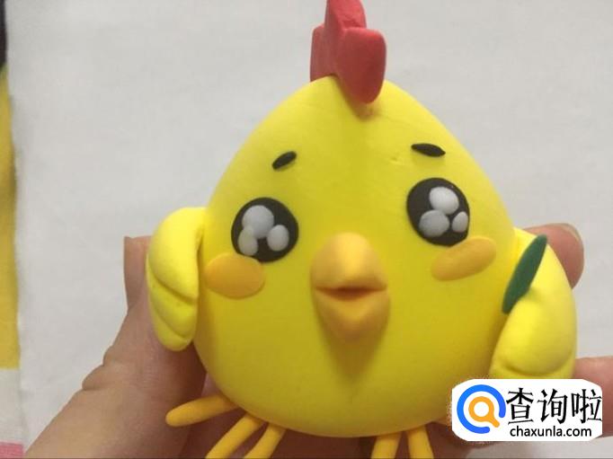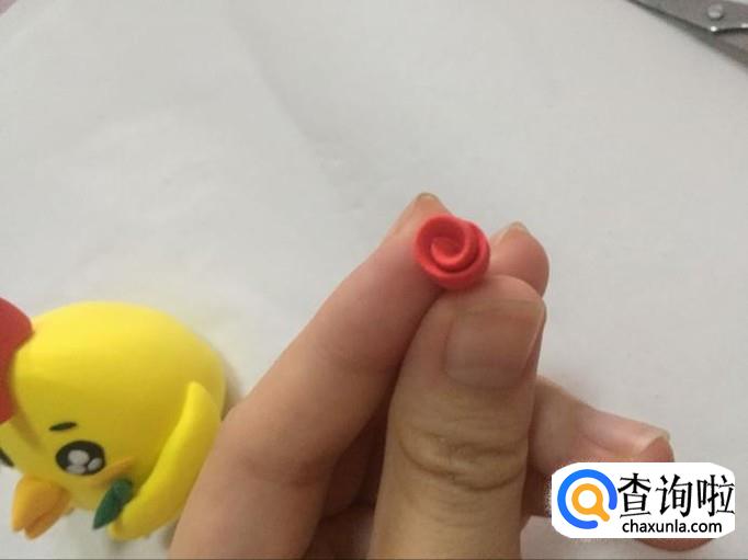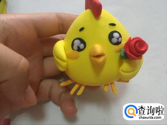 在鸡的翅膀上黏上一个绿叶子,红粘土搓条压扁卷起做成玫瑰,小鸡完成!