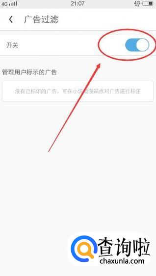 然后在广告过滤中,打开【开关】,如下图所示: