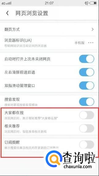 然后在【网页浏览设置】页面中,关闭后三项,如下图所示: