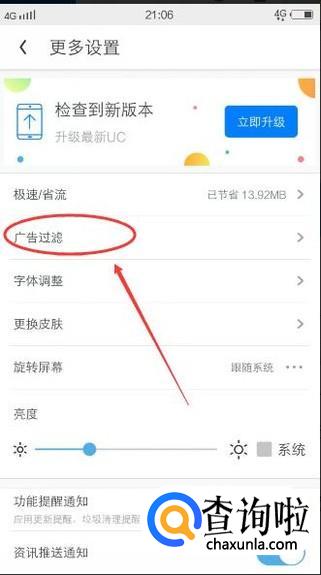 在弹出的【更多设置】中,点击【广告过滤】,如下图所示: