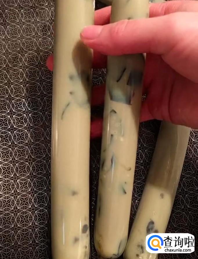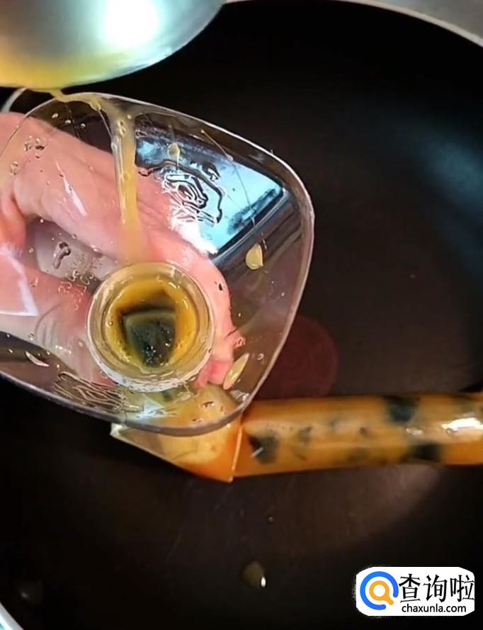 接着我们把肠衣的一头挤扣,把搅拌好的鸡蛋液灌入肠衣中,挤好
