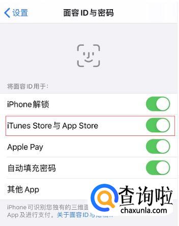 打开 iPhone“设置”-“面容 ID 与密码”,然后根据提示输入锁屏密码,确保“iTunes Store 与 App Store”选项已打开。