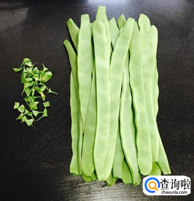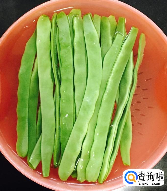 新鲜的豆角择去两端清洗干净,放入容器中用清水浸泡30分钟左右,更好的去除农药残留,浸泡好的豆角沥干水分后切成大小均匀的豆角段备用