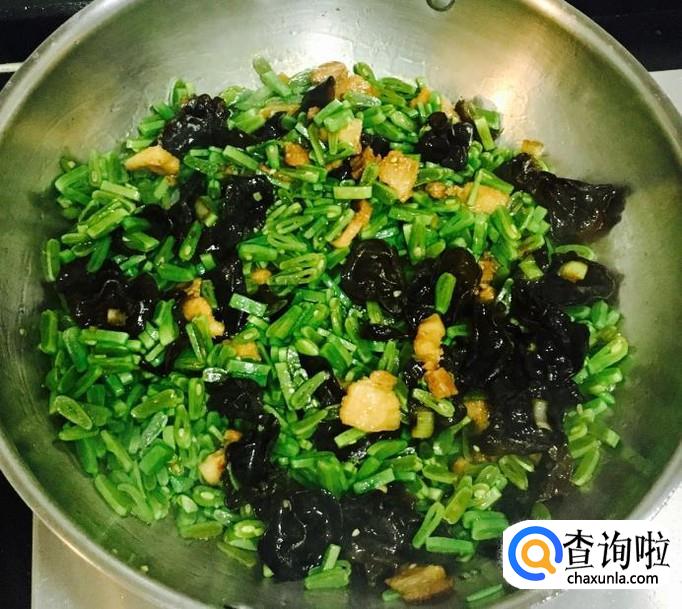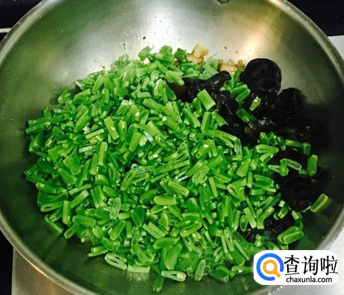倒入豆角段和木耳块翻炒均匀并且炒干豆角的水分