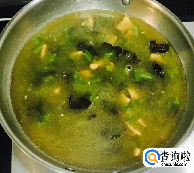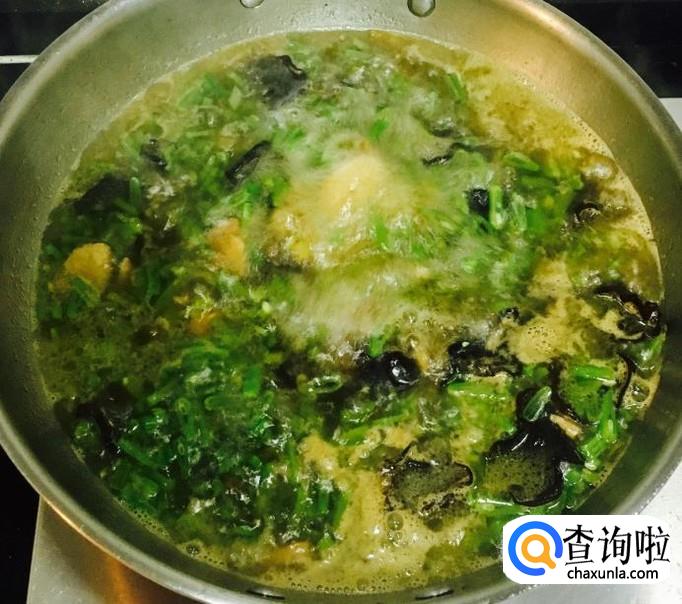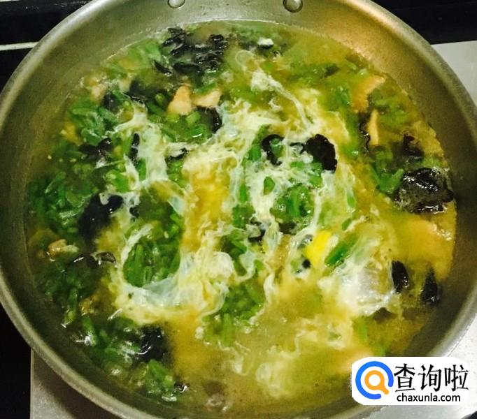 煮至豆角断生后均匀的淋入鸡蛋液,用汤勺轻轻的搅拌均匀使鸡蛋液熟透后关火,撒入韭菜段再次搅拌均匀即可。卤汤制作完成下步开始煮面