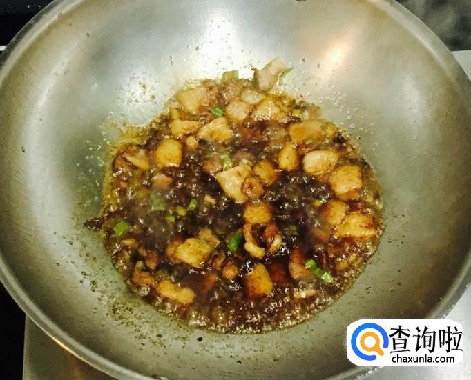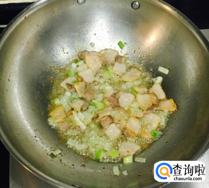 热锅加入适量的花生油把五花肉片炒香并且出油,把葱花爆香,料酒、生抽烹锅并翻炒均匀