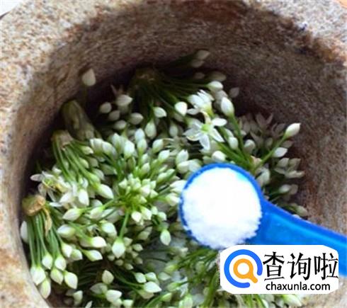 找一个捣蒜泥的蒜缸,把韭菜花放进去捣。虽然现在都有料理机,可我还是觉得捣出来的韭花酱更好吃。加上一些食盐,能让韭菜花酱有些咸味就可以。