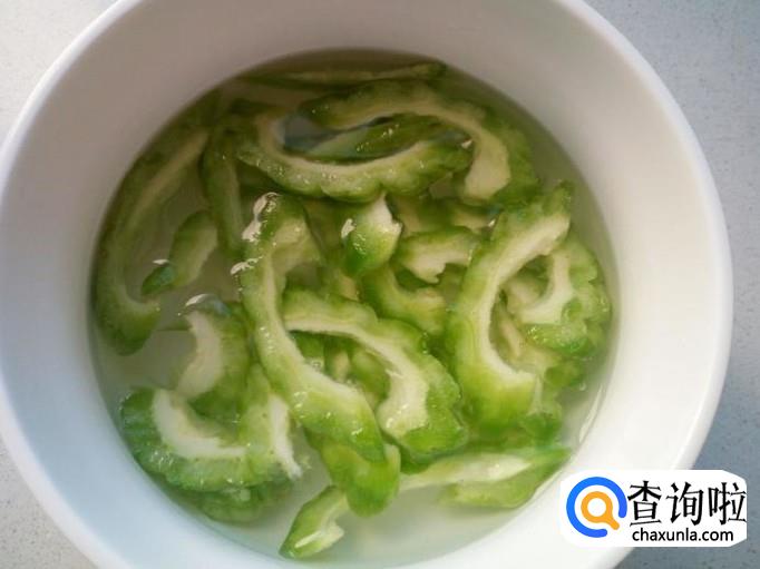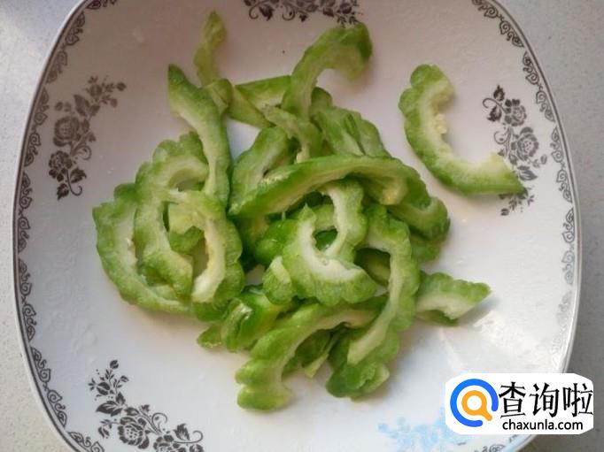 苦瓜去瓜瓤,用水清洗干净,控干水分,切成片。放入水中浸泡一下,去除苦味,然后再用水投几遍,控干水分。
