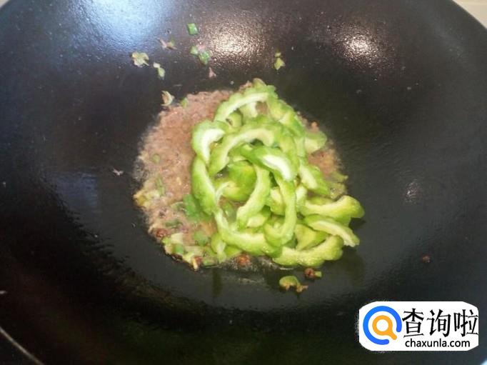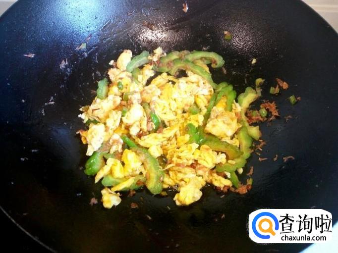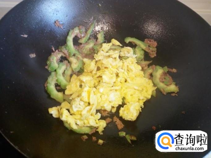 随即放入苦瓜翻炒,炒至苦瓜断生,放入炒好的鸡蛋。