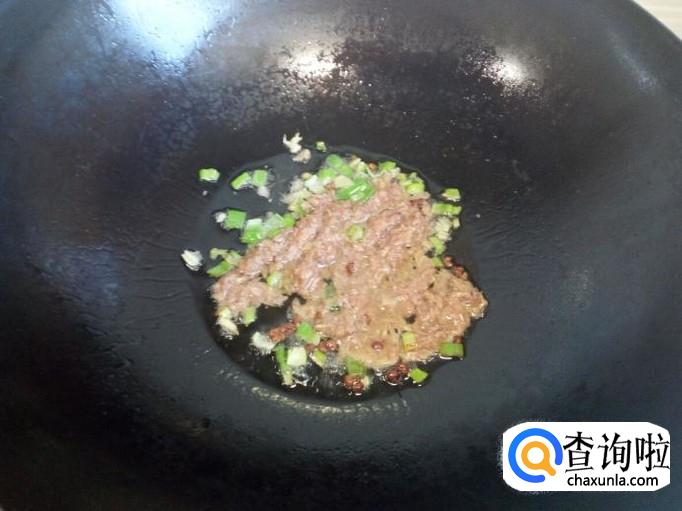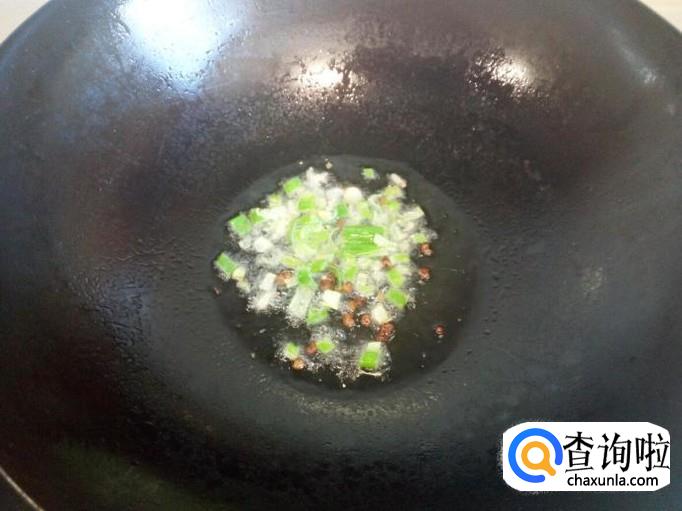 锅里放入油加热,油热后放入花椒,葱,姜,爆锅。放入两匙儿虾酱炒香。