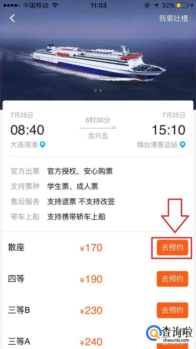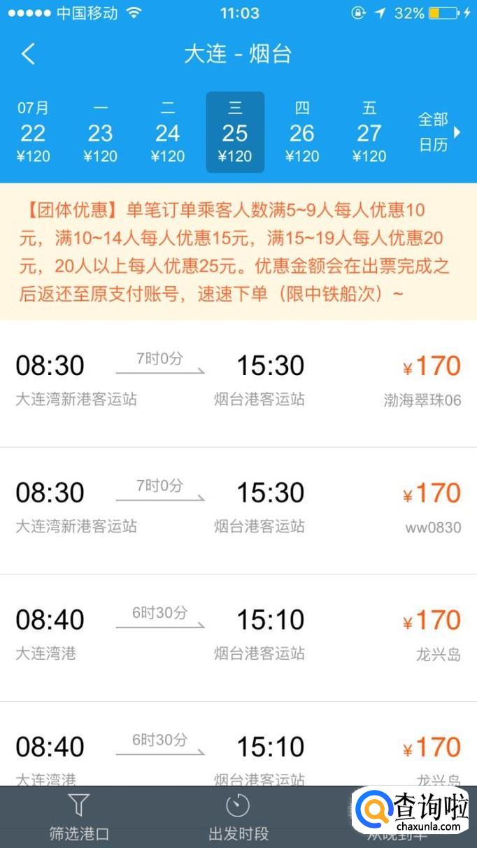 出发地选大连,目的地选烟台,选择你预计出行的日期,点查询。