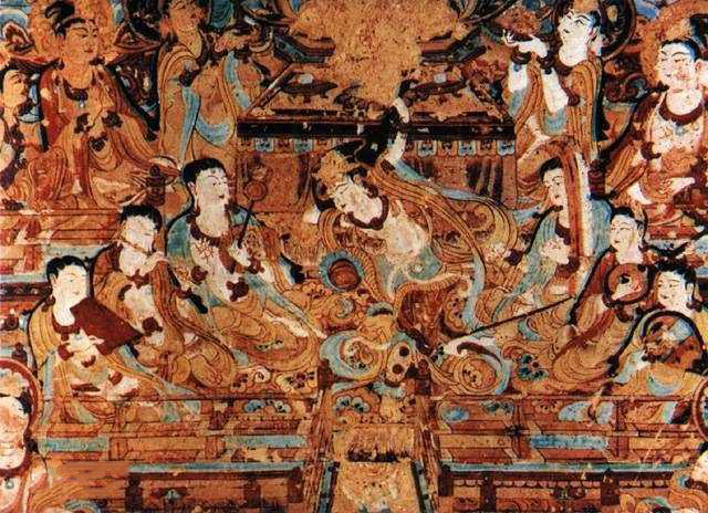 敦煌壁画始于十六国和北魏时期,在西魏时期得到进一步发展,北周逐渐成熟,高峰时期是唐期,题材丰富,形象生动,净土变相、经变画和故事画,都反映了大量的社会现实生活,由于历史的原因,敦煌艺术在宋朝时期走向了衰落。