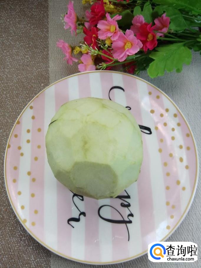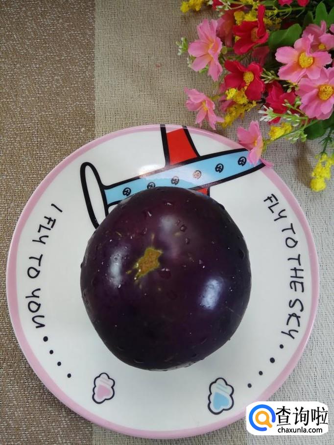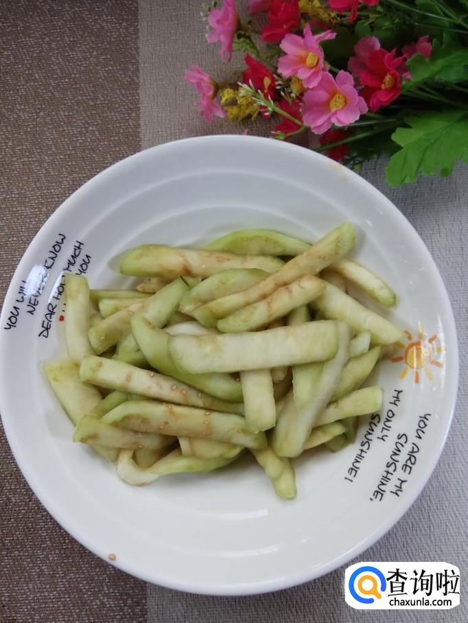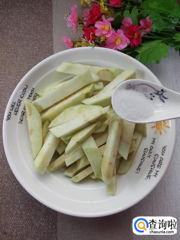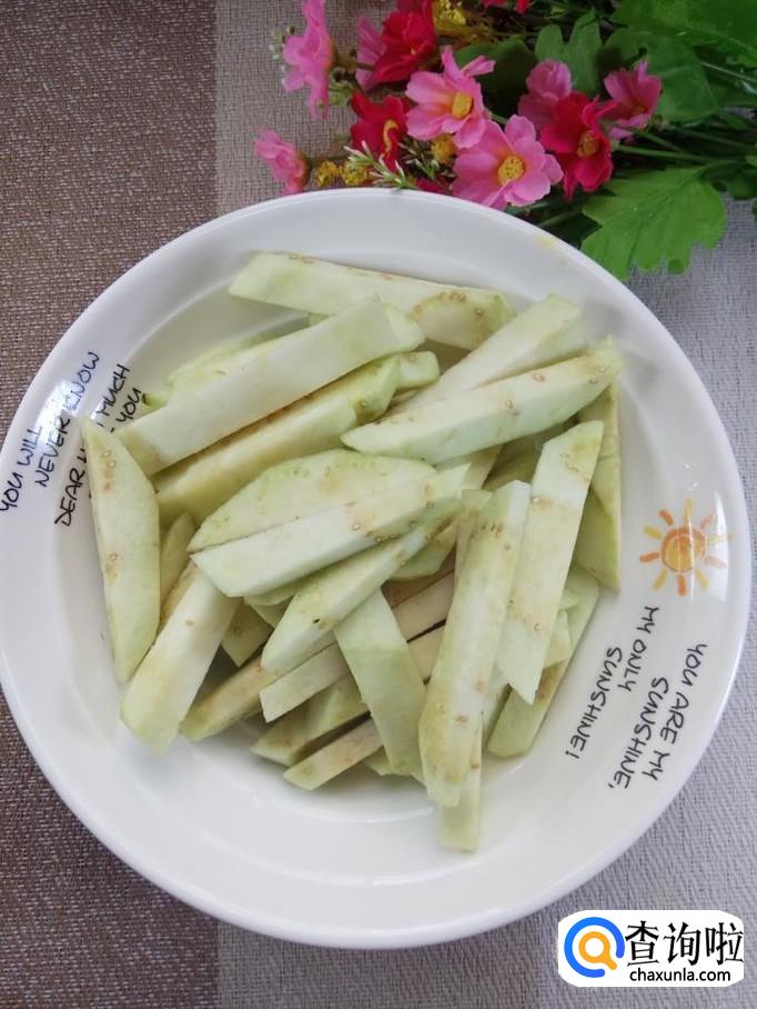 准备一个圆茄子,削去外皮,切成长条,放入盘中备用,圆茄子的外皮有点硬,所以最好将皮去掉。