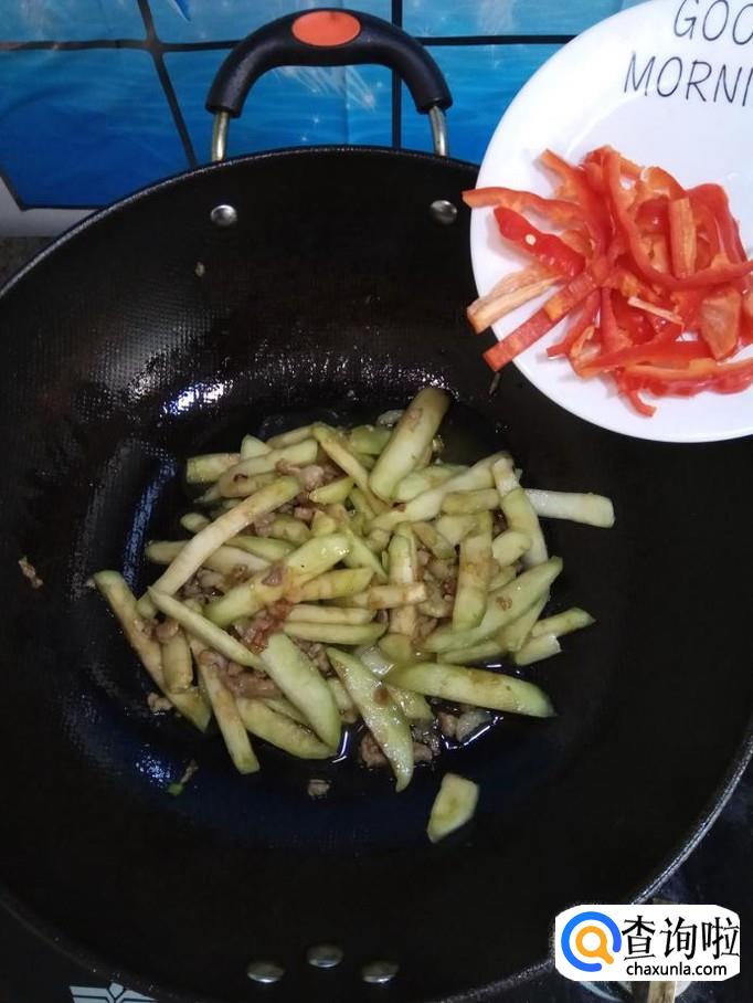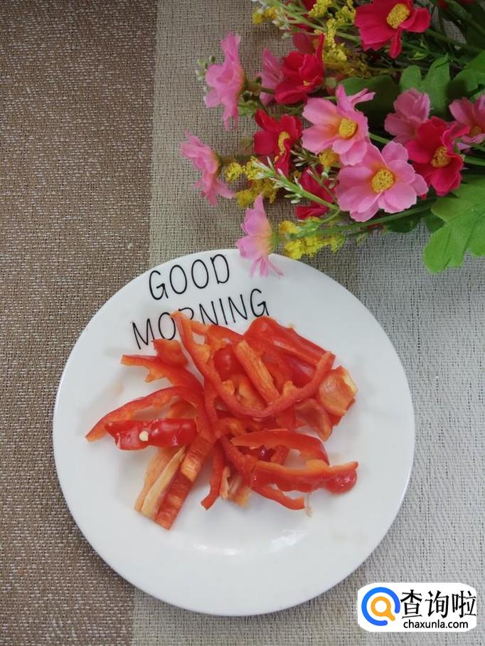 准备适量红椒,洗净后取出适量,切成丝,倒入锅中,不仅营养,而且可以让菜肴的色泽更加好看。