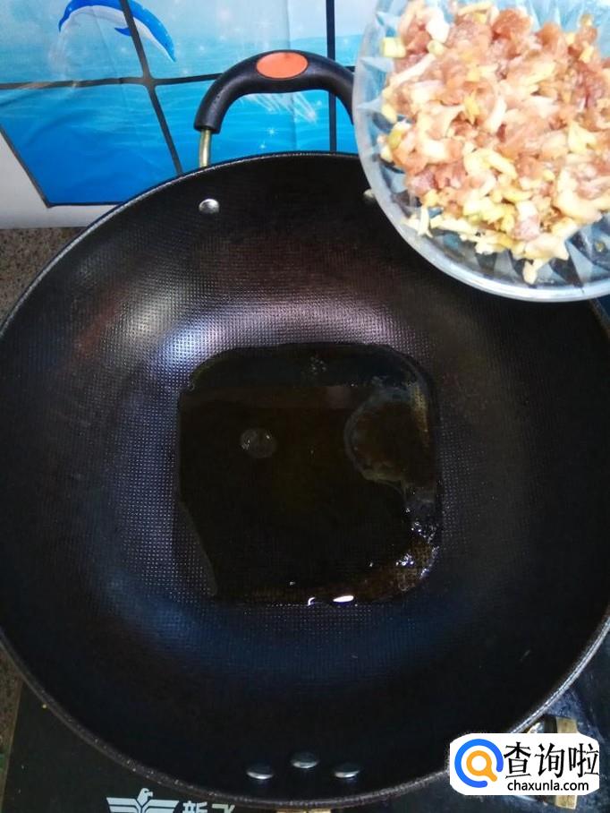 炒锅中放入适量油,油热后,将肉丝放入锅中炒香。