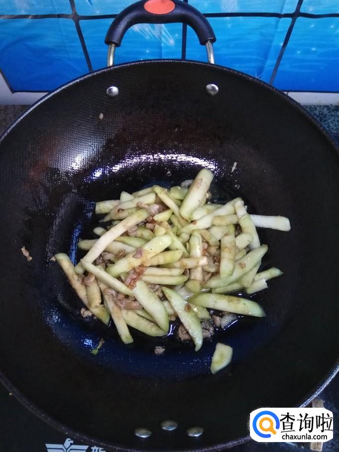 加入一勺白砂糖,等白砂糖融化后,出现糖色,然后将处理好的茄子,放入锅中,翻炒均匀。
