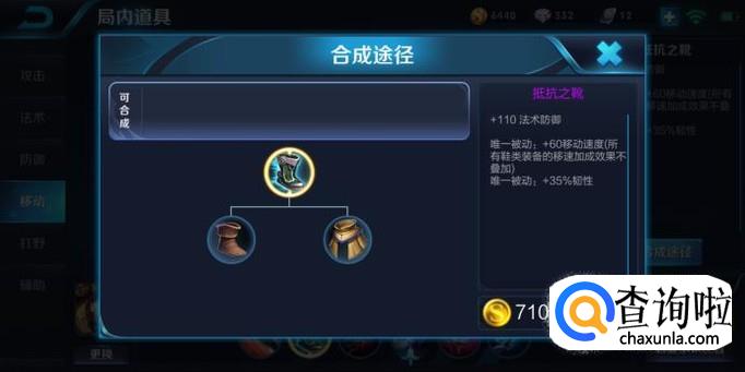 作为一个射手,肯定希望他有一定速度和反抗能力,避免被抓影响发育,在这儿小编就推荐玩家出抵抗之靴,这件装备可以+110法术防御,两个被动分别是+60移动速度和+35%的韧性,韧性可以避免被花木兰这类英雄combo。